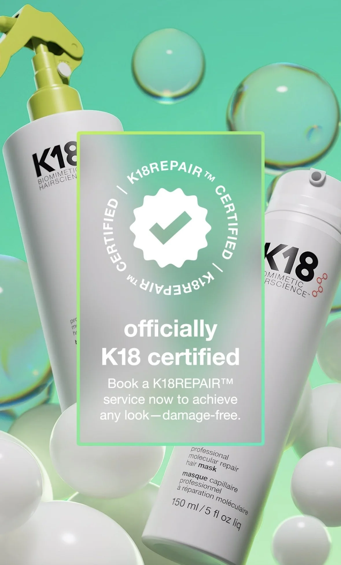 At Mixed Creations we’re proud to be an official K18 salon offering the latest in hair repair technology. K18 is not a conditioning treatment. It’s a revolutionary, science- backed formula that repairs damaged hair from inside out using biomimetic peptides that reconnect broken keratin chains.